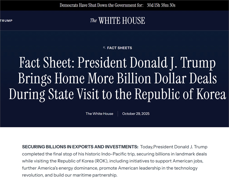 도널드 트럼프 미국 대통령이 인도·태평양 순방의 마지막 방문국인 대한민국(ROK)에서 총 660억 달러(약 95조 원)에 달하는 대규모 수출 및 투자 계약을 체결하며 일자리 창출과 산업 경쟁력 강화를 이끌었다. 이번 방한은 미국의 에너지 패권, 기술 혁신, 해양산업 협력 등 주요 분야에서 양국 협력을 한층 강화하는 계기가