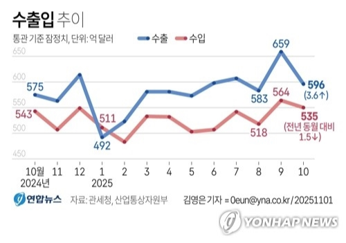 한국의 10월 수출이 도널드 트럼프 미국 대통령의 고율 관세 조치와 긴 추석 연휴에도 불구하고 전년 동월 대비 3.6% 증가한 것으로 집계됐다. 반도체와 선박이 수출 호조를 이끌며 한국 경제의 버팀목 역할을 한 셈이다.10월 전체 수출액은 595억7천만달러로 역대 10월 중 가장 많았다. 특히 반도체 수출이 25.4% 늘