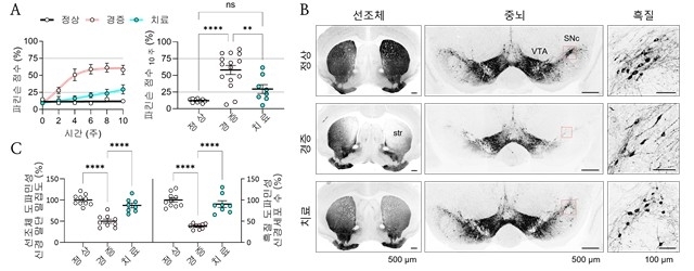 연구팀은 이어 광유전학 기술을 적용해 신경세포 기능을 빛으로 조절한 결과, 생쥐의 보행과 팔다리 움직임이 매끄러워지고 떨림 증상이 줄어드는 효과를 확인했다. 격일 주기(하루걸러 한 번) 자극 방식이 가장 효과적이었으며 도파민 분비 신경세포 보존도 확인됐다.
