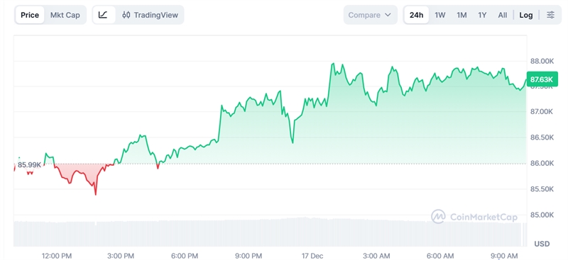비트코인(Bitcoin)이 최근 24시간 동안 1.92% 상승해 8만7,526달러를 기록하며, 같은 기간 1.33% 오른 전체 암호화폐 시장 대비 상대적 강세를 보였다. 기술적 반등 신호, 숏 스퀴즈 가능성, 기관 투자자의 누적 매수 흐름이 복합적으로 작용한 결과다.