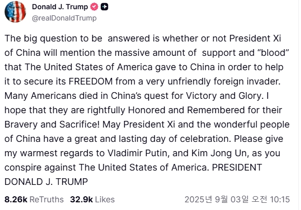 도널드 트럼프 대통령이 전승절을 맞아 중국을 향해 던진 메시지는 단순한 외교적 언급이 아니다. 그것은 미국의 피와 희생을 망각하는 자들에 대한 경고장이었다. 미국이 수많은 청년들의 목숨을 바쳐 중국을 도왔기에 오늘의 중국이 존재한다. 그럼에도 중국은 이제 러시아, 북한과 손잡고 미국을 겨냥하는 오만을 보이고 있다. 역사를