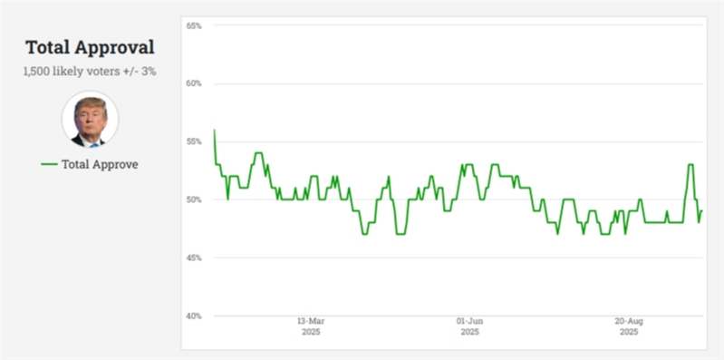 미국 현지 시각 2025년 9월 26일 금요일, 라스무센 리포트(Rasmussen Reports) 일일 추적조사에서 도널드 트럼프 대통령 직무 수행 ‘찬성 49%, 반대 50%’가 집계됐다. 강한 찬성 34%, 강한 반대 41%로 대통령 승인지수는 -7이다. 라스무센은 트럼프 2기 내내 매일 승인을 집계해 왔다. 9월 중