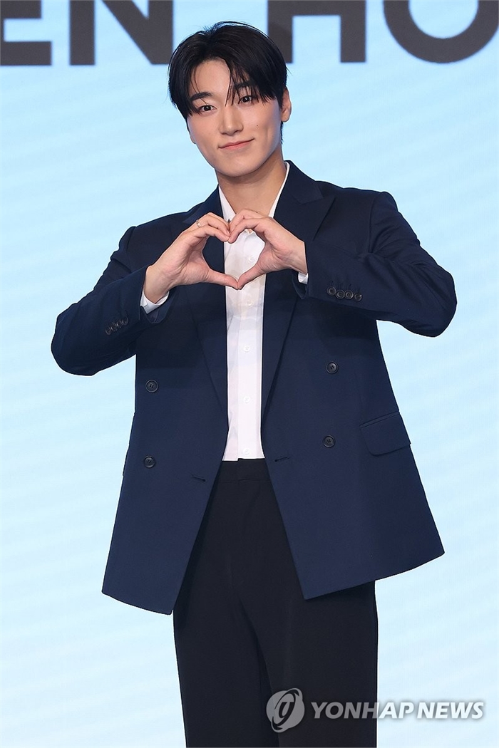 에이티즈 산, 듬직한 하트 (서울=연합뉴스) 강민지 기자 = 그룹 에이티즈(ATEEZ)의 산이 12일 서울 마포구 호텔 나루 서울 엠갤러리에서 열린 미니 12집 '골든 아워 : 파트 3'(GOLDEN HOUR : Part.3) 발매 기념 기자간담회에서 포즈를 취하고 있다. 2025.6.12 mjkang@yna.co.kr