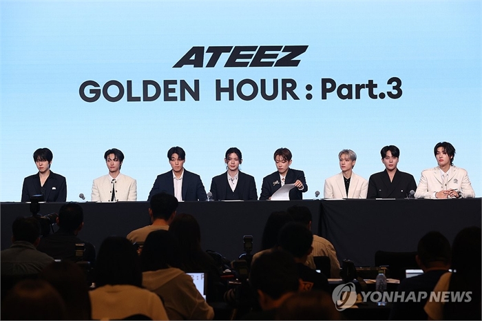 에이티즈 기자간담회 (서울=연합뉴스) 강민지 기자 = 그룹 에이티즈(ATEEZ)가 12일 서울 마포구 호텔 나루 서울 엠갤러리에서 미니 12집 '골든 아워 : 파트 3'(GOLDEN HOUR : Part.3) 발매 기념 기자간담회를 하고 있다. 2025.6.12 mjkang@yna.co.kr