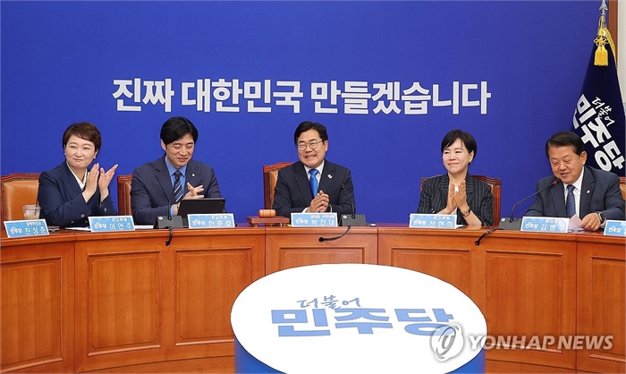 활짝 웃는 박찬대 직무대행 (서울=연합뉴스) 류영석 기자 = 더불어민주당 박찬대 당대표 직무대행 겸 원내대표가 13일 국회에서 열린 최고위원회의에 참석해 의원들과 웃으며 대화하고 있다. 2025.6.13 ondol@yna.co.kr