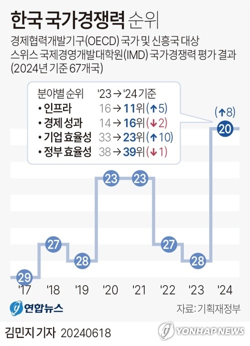 [그래픽] 한국 국가경쟁력 순위 (서울=연합뉴스) 김민지 기자 = 18일 기획재정부에 따르면 한국이 스위스 국제경영개발대학원(IMD) 국가경쟁력 평가에서 67개국 중 20위를 차지해 역대 최고 순위를 기록했다.