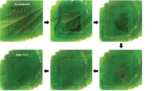 녹색 잎 위에 위치한 소자가 72시간 내 물속에 완전히 녹아 없어지는 모습 [KIST 제공. 재판매 및 DB 금지]