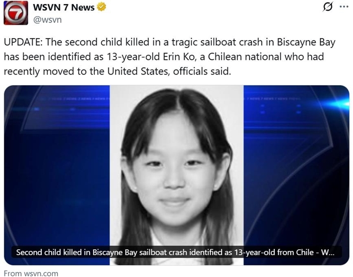 미국 선박-요트 충돌사고 희생자 신원을 보도한 WSVN 엑스 게시물 [@WSVN X 게시물 캡처. 재판매 및 DB 금지]