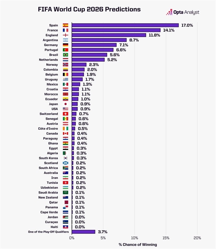 옵타는 “아르헨티나의 2연속 우승 도전, 스페인의 상승세, 노르웨이의 약진 등 다양한 변수가 존재한다”며 조 추첨 결과에 따라 판도가 달라질 수 있다고 설명했다.